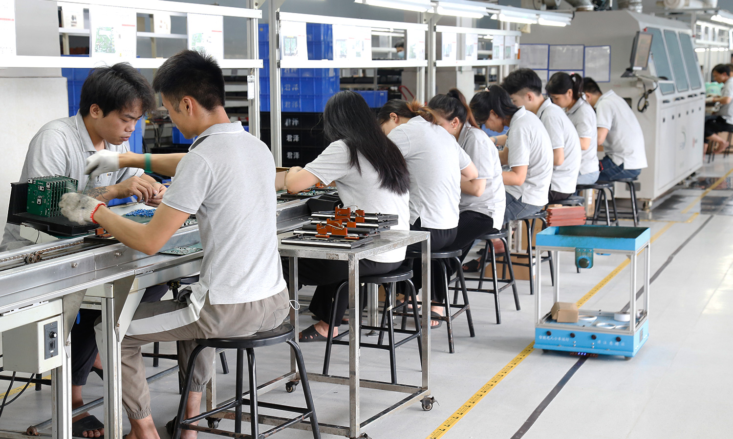 现有组装流水线2条现代化的生产线(可随时扩成4条),对太阳能控制器,逆变器,储能、工业降噪耳机、等工业产品组装经验丰富 ;能够生产绝大部分的数码电子产品,极强的综合生产能力,日产能达到1万PCS以上。防静电PVC空调车间,配备有老化房,测试房,成品测试隔音隔离房等,设备先进、完善,可进行各种产品镭雕、组装、老化、测试、包装等生产。